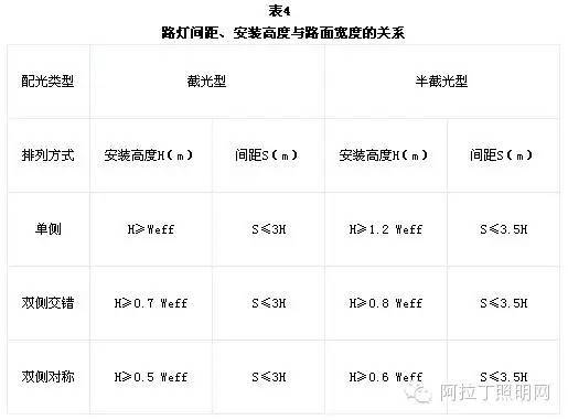 路燈排列一般有單側、雙側交錯、雙側對稱和路中央4種排列方式。對稱排列時N=2,其它排列時,N=1。