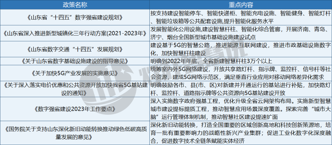 從匯總到的政策來看,山東省從數字基礎設施、智慧交通、城鎮化轉型等方面都重點提及到了智慧燈桿。