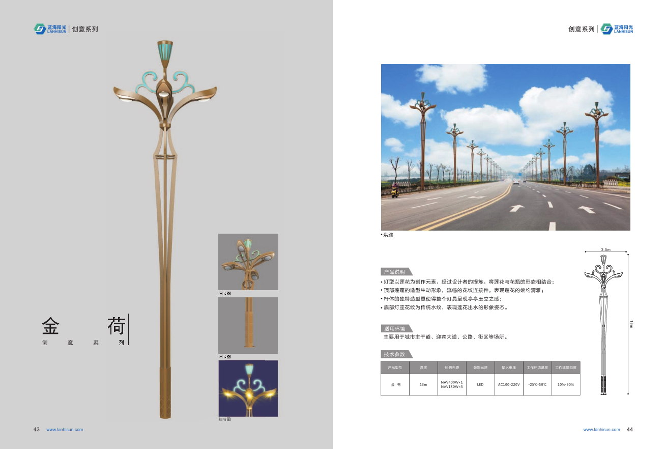 1、高度為6-16米; 2、花葉光源為4組LED光源,色溫2500-6500K,其余光源為LED裝飾光源,每個光源功率為30-60W; 3、LED驅動電源壽命可達五年; 4、整體熱鍍鋅噴塑,保證燈桿15年不生銹; 5、可以根據使用地區的地域文化、產業特點等進行文化定制;