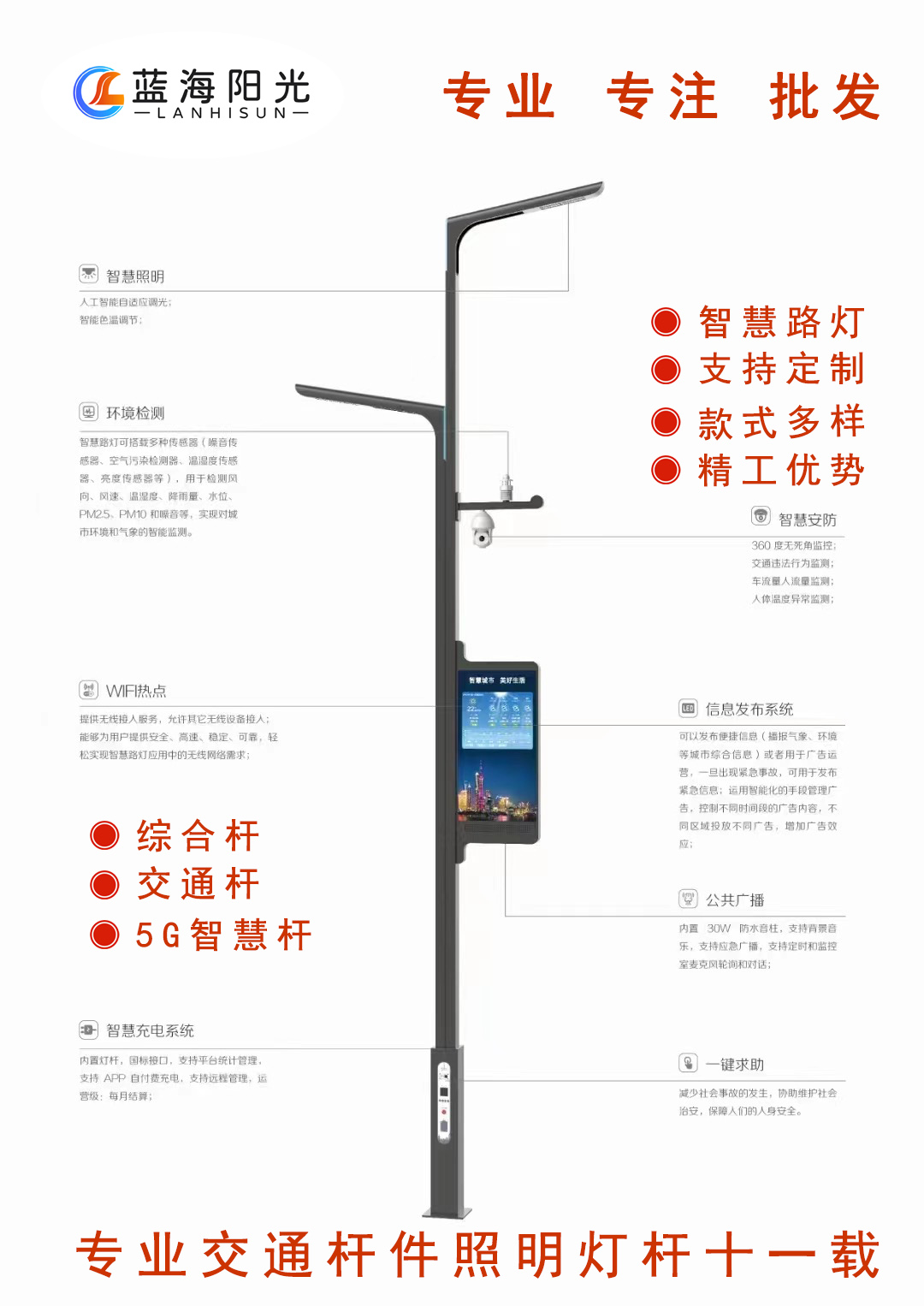 多功能交通桿:智慧城市交通管理的“全能衛(wèi)士隨著城市化進(jìn)程加速,傳統(tǒng)交通設(shè)施已難以滿足復(fù)雜路況的管理需求。在此背景下,**多功能交通桿**憑借其集成化、智能化的設(shè)計,成為現(xiàn)代智慧交通建設(shè)的關(guān)鍵設(shè)備。本文將從技術(shù)亮點、應(yīng)用價值及發(fā)展趨勢三大維度,解析這一創(chuàng)新產(chǎn)品如何賦能城市交通管理。一、技術(shù)突破:多功能交通桿的六大核心功能??1. 智能監(jiān)控與